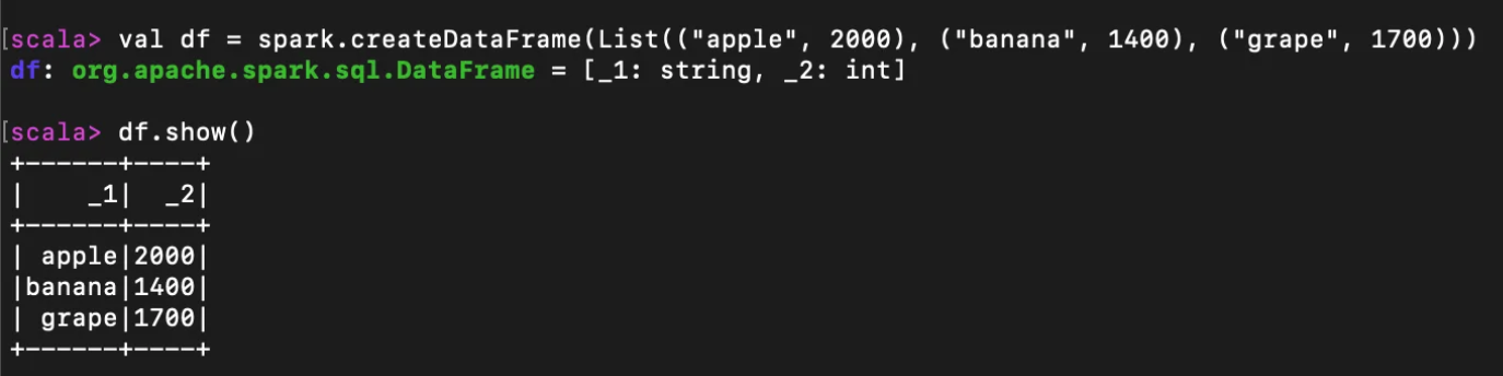 val df = spark.createDataFrame(List(("apple", 2000), ("banana", 1400), ("grape", 1700)))